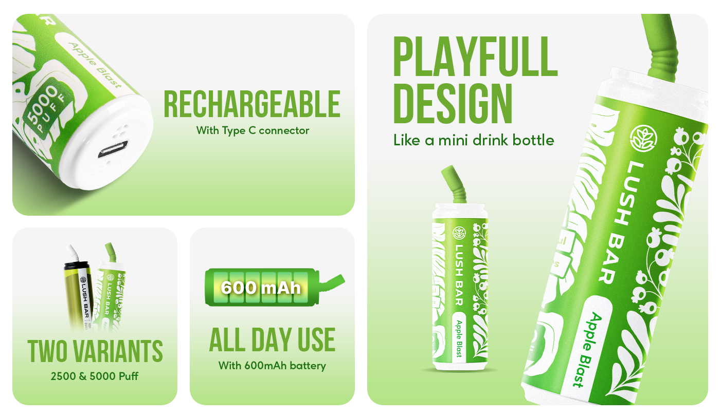 Lush Bar stands out with its rechargeable design — powered by a 600mAh battery and a convenient Type-C charging port.